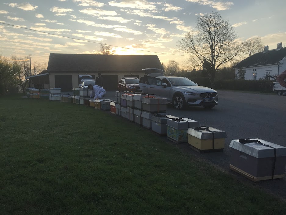 Utstyrene hentes rett etter fristen og fraktes til bigårdsplassen, og biene blir plassert i kubene deres.